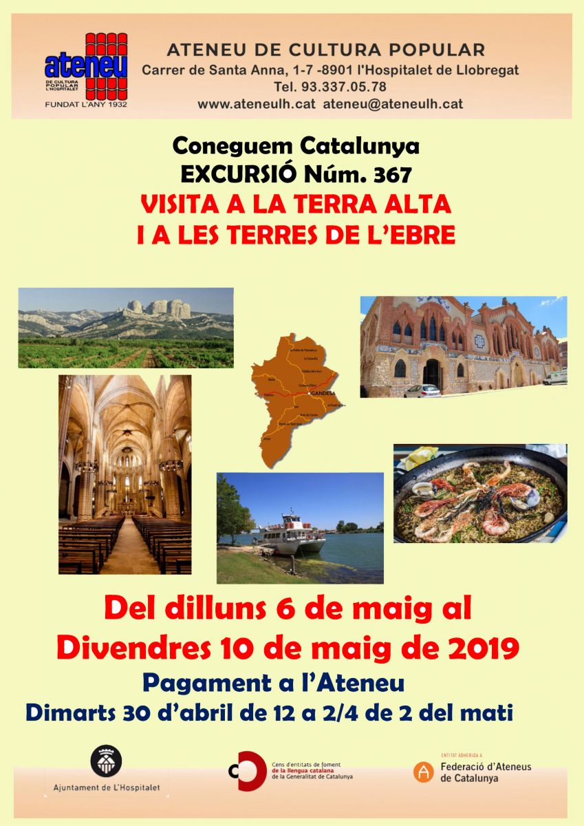 I A LES TERRES DE L'EBRE" Del dilluns 6 de maig al divendres 10 de maig de 2019 Pagament a Secretaria Dimarts 30 d'abril de 12 a 2/4 de 2 del mati ******************** |